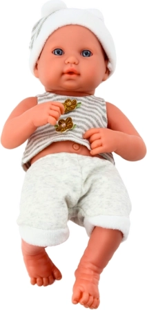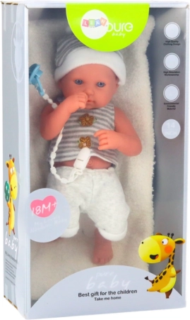 Denne realistiske dukke i et blidt hvid‑gråt outfit imponerer med detaljerede ansigtstræk og behageligt tilbehør. Takket være de bevægelige lemmer kan børn nyde interaktiv leg, bleskift og putning under det bløde tæppe. Der medfølger også en sut på snor, som ikke bliver væk.