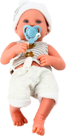 Den søde babydukke i hvid‑gråt tøj glæder små omsorgsgivere med sit realistiske udseende og tilbehør. Den har bevægelige arme og ben, en sut på snor og et blødt tæppe til hygge. Den er lavet af sikre materialer og understøtter empati, finmotorik og kreativ leg.
