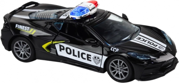 Den kommer i en tofarvet variation - hvid og sort, og farven leveres tilfældigt for en overraskende oplevelse ved køb. Bilen er dekoreret med autentiske politimønstre, inklusiv mærkater og karakteristiske politikskærme på taget, som kan være røde eller blå.