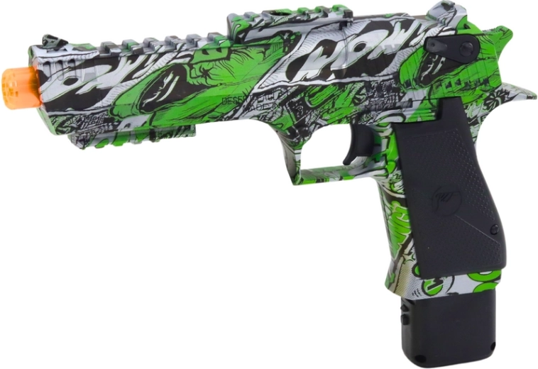 Pistolen kendetegnes ved et dynamisk farvedesign – den kommer i en intens grøn farve, som giver energi og tiltrækningskraft. Derudover er den dekoreret med sølvfarvede elementer, som giver et futuristisk og moderne look. Hele designet er prydet med graffiti, hvilket tilfører en urban karakter og en unik stil, der fanger opmærksomheden og adskiller den fra andre legetøj.