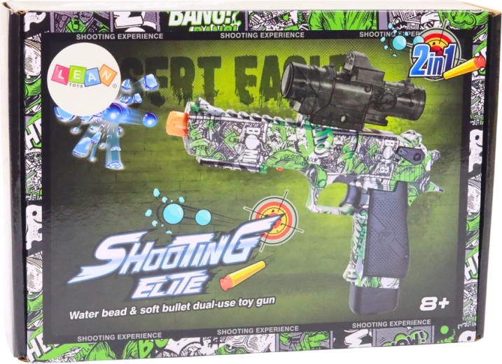 2-i-1 pistolen tilbyder utrolig alsidighed og gør det muligt at skyde både vandkugler og sugekop-pile. Takket være denne funktion bliver legen aldrig kedelig, og brugeren kan nemt tilpasse legeformen til aktuelle behov og præferencer. Pistolen leveres både med vandkugler og to sugekop-pile. Disse pile er ideelle til at skyde mod en skive og hæfter på glatte overflader, hvilket giver mulighed for mange sjove og konkurrenceprægede scenarier.