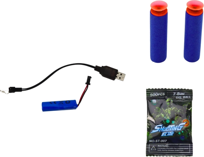 Pistolen drives af et 3,7V 500mAh batteri, som er inkluderet i sættet. En oplader medfølger i pakken.