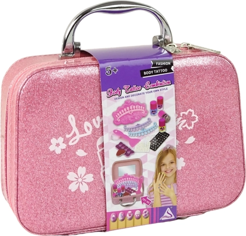 - Lyserød glitrende kuffert med spejl, 4 farvede neglelakker, tåskiller, fil, stempel, stempelplade med mønstre, skraber/spatel, 3 tip-skabeloner, tip-klistermærker, stickers og rhinsten, lille beholder