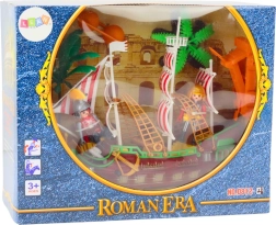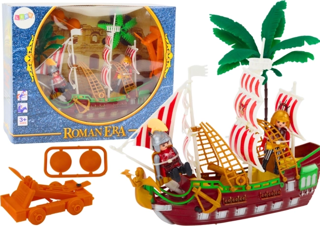 Takket være de indbyggede hjul bevæger skibet sig let over gulv og bord, mens katapulten, palmerne og figurer af romerske soldater gør det muligt at skabe dynamiske slag og historiske scener.