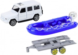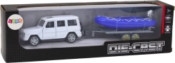 Terrængående bil med motorbåd er det perfekte legetøj til små eventyrere, der kombinerer stil og funktionalitet. Den elegante hvide bil med trailer og blå båd tilbyder utallige muligheder for sjov og kreativ leg.