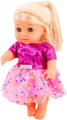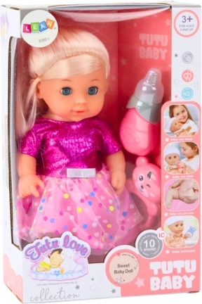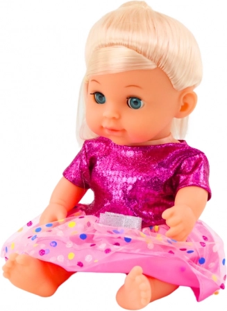 Denne charmerende dukke med blondt hår og blå øjne er ideel til at efterligne babypleje. Takket være de bevægelige arme, ben og hoved kan den nemt sættes eller lægges, og den realistiske tisset-funktion efter at have drukket fra flasken gør legen endnu mere autentisk.