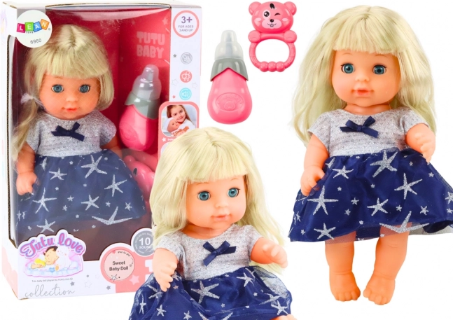 Den elegante dukke i sømandskjole med langt blondt hår giver mulighed for at børste og style i forskellige frisurer. Dens realisme understøttes af bevægelige lemmer og øjne, der lukker, som efterligner en baby der sover.