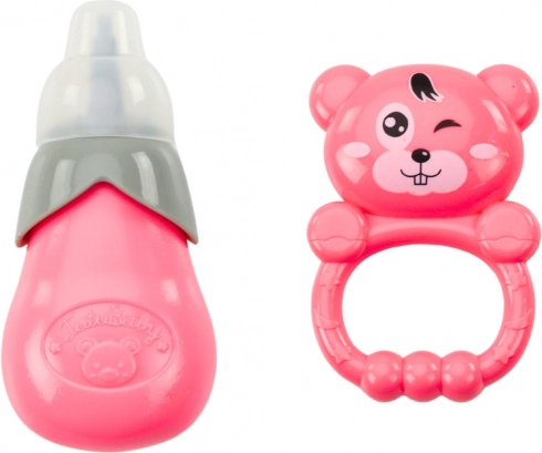 Sættet inkluderer en sutteflaske, der kan fyldes med vand, så dukken kan "tisse". Ranglen fremmer motorisk udvikling og koordinering.