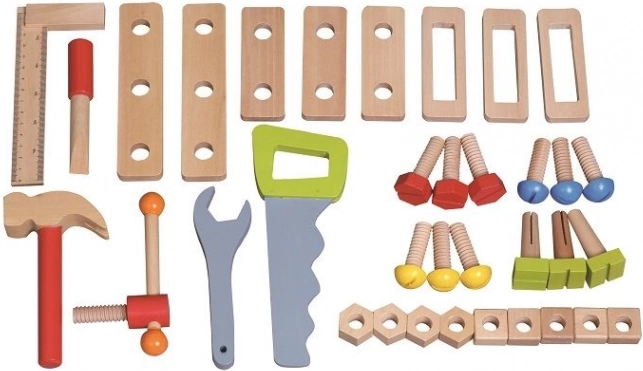 - Træværksted + værktøjssæt (hammer, sav, skruetrækker, nøgle, skruer, møtrikker, tandhjul og flere dele)