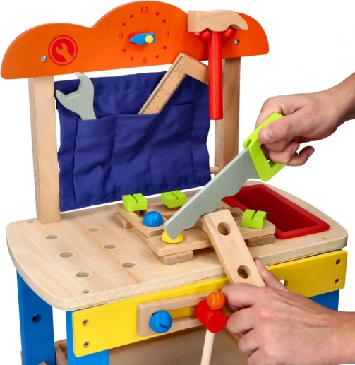 Takket være de kompakte mål og en bordhøjde på 34 cm er værkstedet ideelt til børneværelset. Det er lavet af træ og leveres med et rigt værktøjssæt, der fremmer selvstændighed, tålmodighed og logisk tænkning.