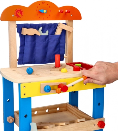 Dette kvalitets træværksted er designet til sikkert at introducere børn til værktøjernes verden. Farverige elementer, funktionelle dele som skruer, møtrikker og tandhjul samt et praktisk rum til værktøj understøtter naturlig nysgerrighed og færdighedsudvikling.