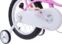 ROYALBABY Little Swan 14" er en charmerende børnecykel i rosa-hvid farvekombination, designet til de første cykelture med maksimal fokus på sikkerhed, komfort og nem læring. Den lette stålramme gør det nemt at stige på, og de brede dæk med skridsikkert mønster sikrer trygt vejgreb.