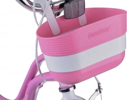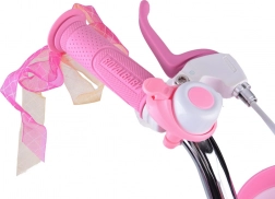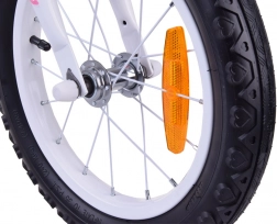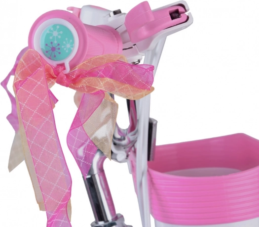 Ergonomisk styr med bløde greb, klokke og frynser vil glæde små ryttere, mens kombinationen af forreste fælgbremse og bageste tromlebremse giver glidende og sikker bremsning. Støttehjul giver stabilitet under indlæring, og den praktiske kurv rummer småting. Kørekomforten fuldendes af et blødt, højdejusterbart sæde med håndtag til føring.