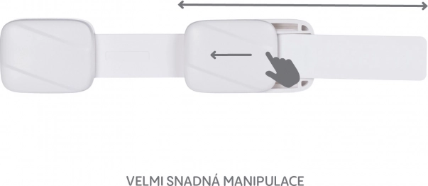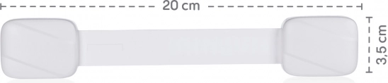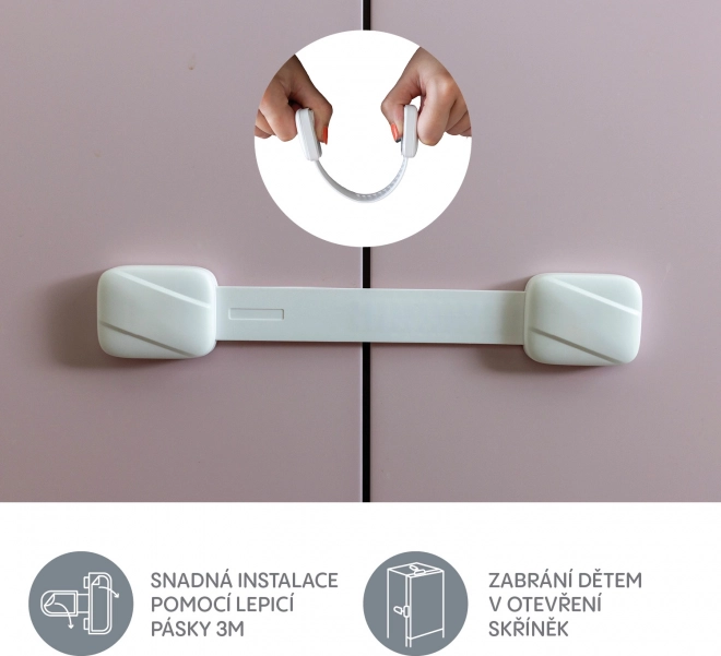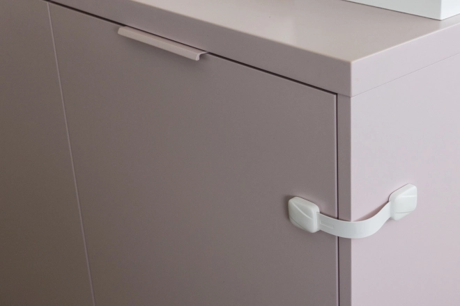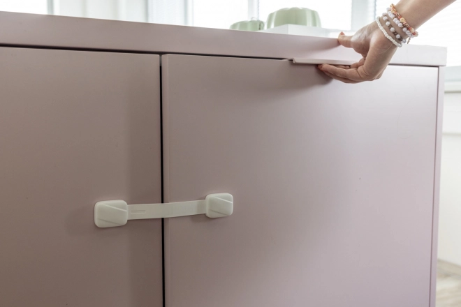 Justerbar hvid børnelås til skabe giver sikkerhed og beskytter børn mod fare. Nem montering og universel anvendelse.
