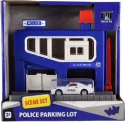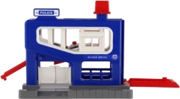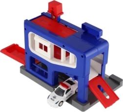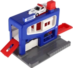 Sættet inkluderer en garage med detaljerede elementer og en bil. Børn kan lege betjente og røvere, race og parkere bilen i garagen. Garagen er designet til børn fra 3 år, og dens kompakte dimensioner gør det nemt at placere den i et værelse eller på et bord.