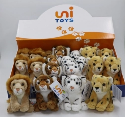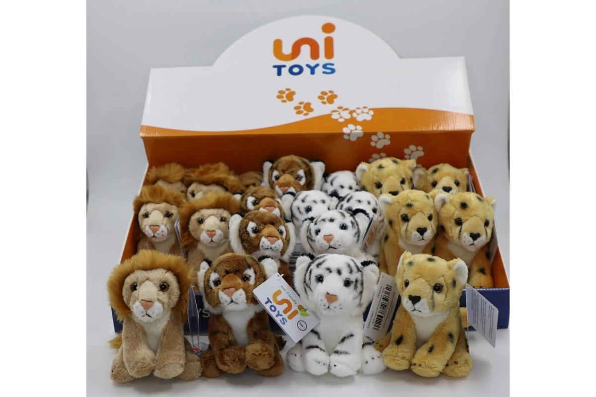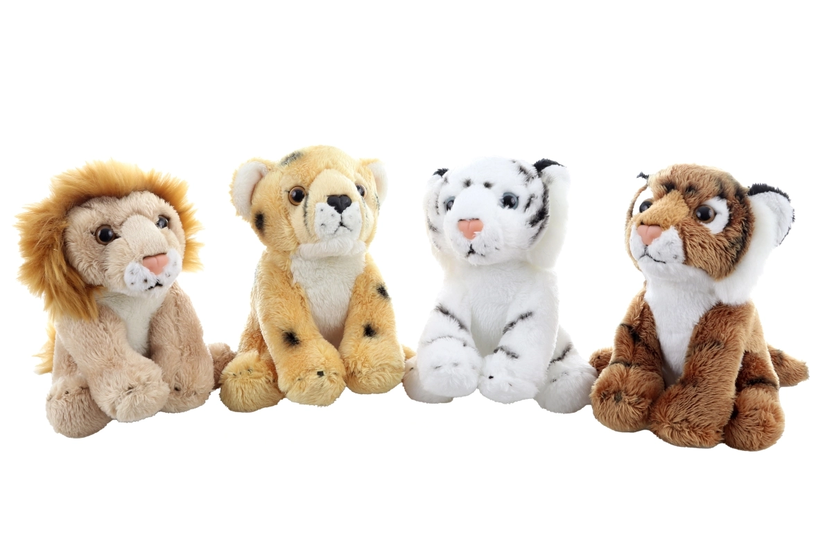 Disse plysdy r er designet med fokus på blidhed og sikkerhed. De kompakte mål 11 × 15 × 14 cm gør dem til skønne ledsagere i sengen, barnevognen og på rejser. Realistiske detaljer som pletter og striber samt løvens manke understøtter børns fantasi og naturforståelse.