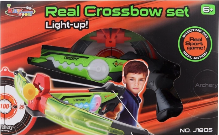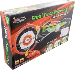 Når der indsættes 2× AAA-batterier, lyser armbrøsten, så du lettere kan sigte selv i skumringen. Perfekt til træning af præcision og sjove konkurrencer.