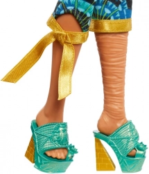 Dukken Cleo De Nile gør sig klar til årets hotteste musikbegivenhed – Monster Fest! Hun skiller sig ud med en top med gyldne ærmer, bukser i juvelfarver og en lotuskrone, der fremhæver hendes lange, blå hår. Takket være leddene kan du nemt indstille seje poser til både billeder og historiefortælling.