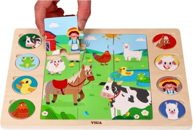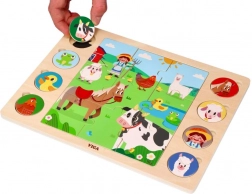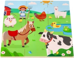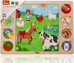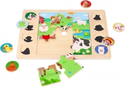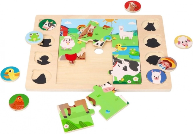 Dette smarte puslespil kombinerer to aktiviteter: først samler børn det centrale billede af 9 store dele, derefter matcher de 8 runde jetoner med dyr til de tilsvarende skygger på pladen. Legetøjet understøtter naturligt udviklingen af ordforråd – når samlingen er færdig, kan børnene navngive dyrene og finde dem på det store gårdmotiv.