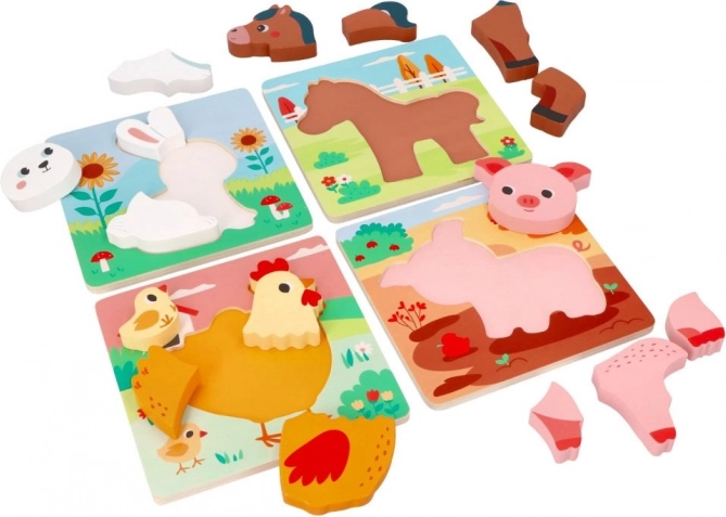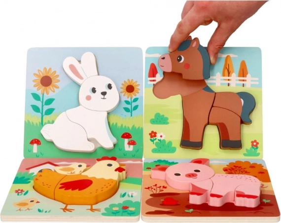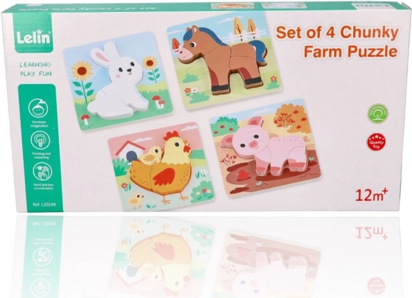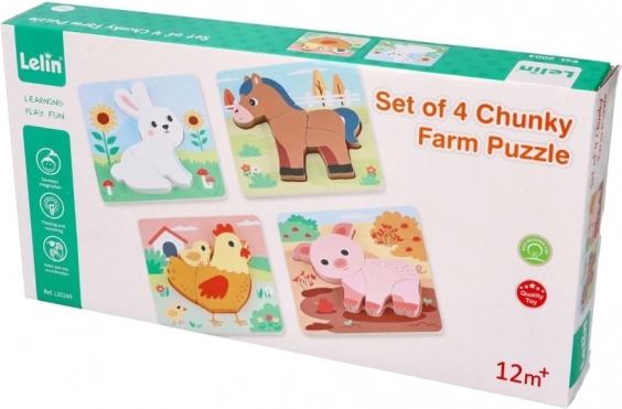 Oplev legende læring med dette sæt af fire træpuslespil med gårdmotiver – kanin, hest, kylling og gris. Hvert puslespil har solide, “chunky” brikker ideelle til små børnehænder og farverige baser, som understøtter genkendelse af former og dyr.