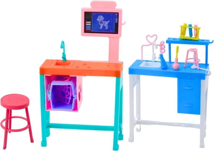 Klinikken inkluderer en vask, en skammel og en computer til realistisk leg med undersøgelse og behandling af dyr.