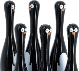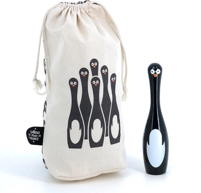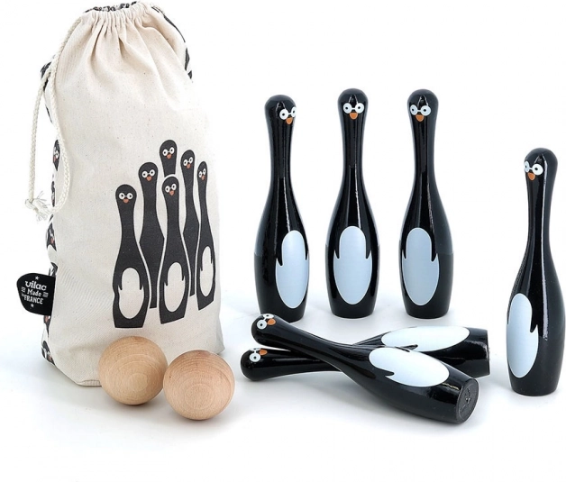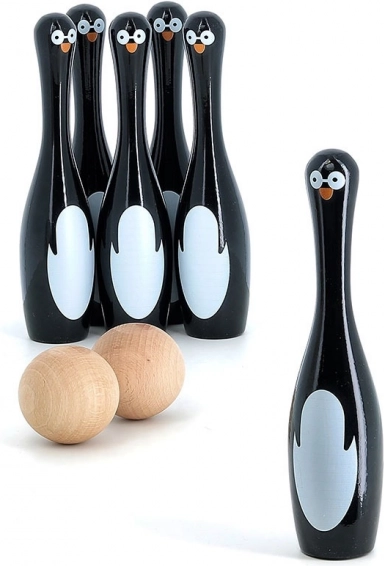Sættet indeholder seks kegler formet som pingviner og to trækugler. Dette spil tilbyder ikke kun timers underholdning men hjælper også med at udvikle motoriske færdigheder og fingerfærdighed. Keglerne er fremstillet i Frankrig ved brug af en traditionel lakproces, der sikrer høj kvalitet og holdbarhed.
