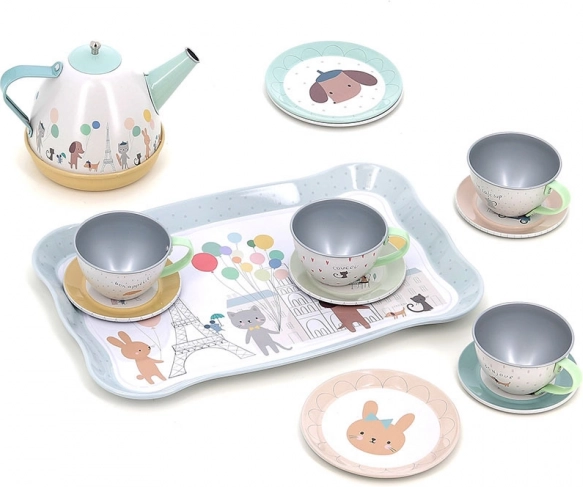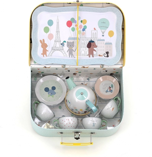 Dette søde sæt indeholder 14 dele illustreret af Sarah Betz, som skaber en parisisk stemning med blide farver og motiver. Sættet inkluderer et fad, en tekande og fire kopper med underkopper – ideelt til fantasifulde teselskaber. Takket være den praktiske kuffert kan sættet nemt transporteres og bruges på rejser.