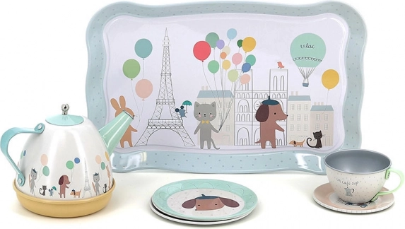 Pyntet med Paris-motiver illustreret af Sarah Betz bringer dette service elegante og farverige indtryk til hverdagens legestunder.