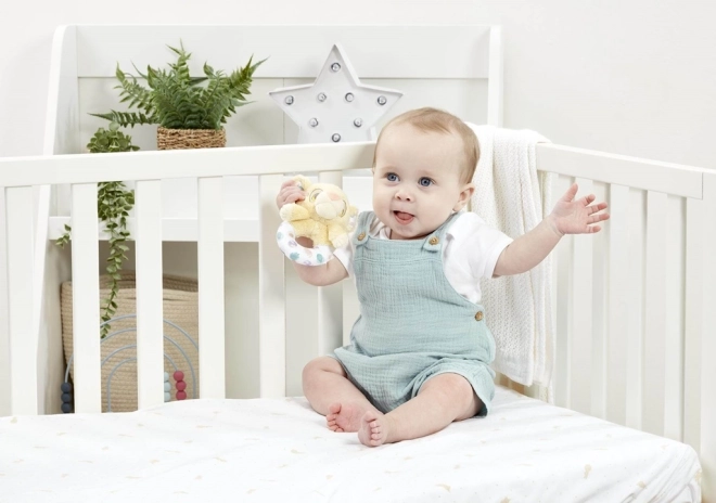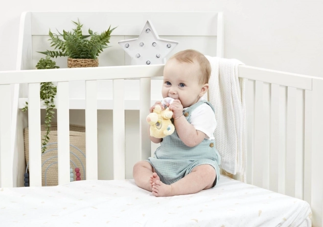 Blød plys, naturligt farveudtryk og en kompakt størrelse gør raslen til det ideelle første legetøj.