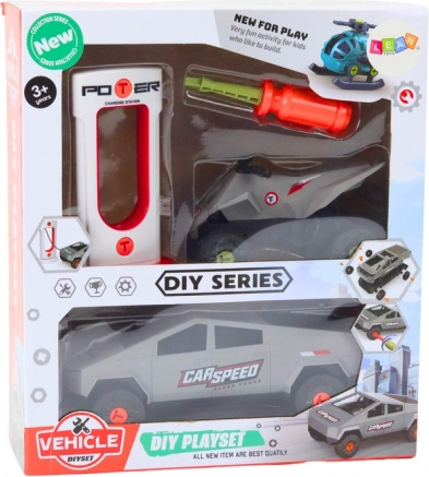 Kreativt sæt til små teknikere: grå moderne bil, quad og ladestation til samling. Børn træner finmotorik og forstår grundlæggende mekanik gennem skruning og samling. Skruetrækker medfølger. Legetøjet er lavet af materialer i høj kvalitet, har CE-certificering og opfylder standarden EN71, egnet til børn fra 3 år.