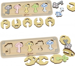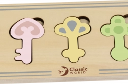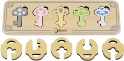 Børn matcher hver nøgle til det tilsvarende udskæringshul, hvilket styrker logisk tænkning samt opfattelsen af former og farver.