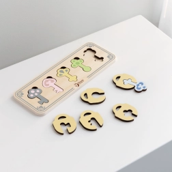 Denne sanselige Montessori-puttekasse giver børn fra 18 måneder en sjov måde at træne logik og tålmodighed på. Hver af de 5 nøgler har sin egen form og farve, og barnet indsætter den i den matchende “lås”. Pladen tilbyder samtidig praktisk opbevaring af alle nøgler, så legen altid er overskuelig.