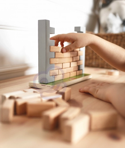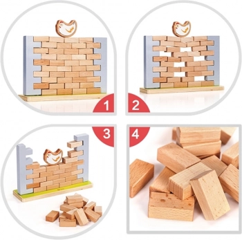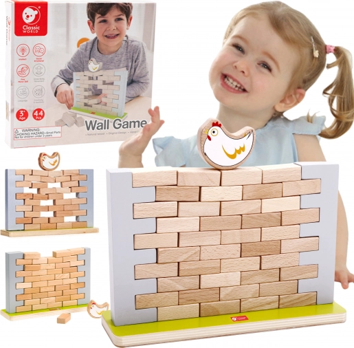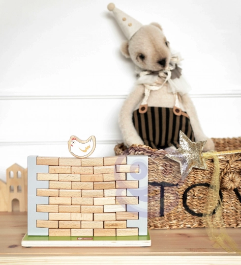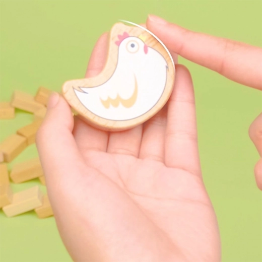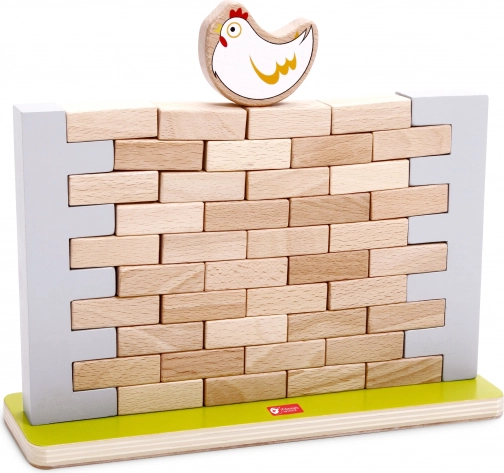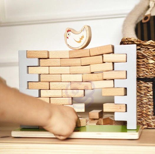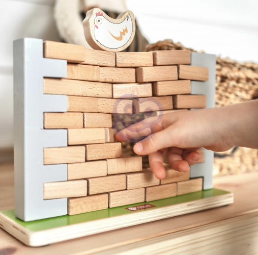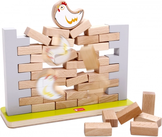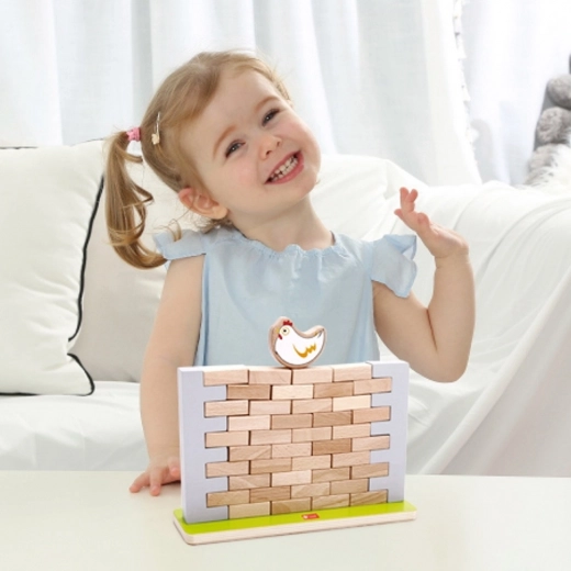 Dette kvalitets træ-balancespil byder på enkle regler og masser af spænding. Målet er at fjerne mursten fra muren uden at hønen på toppen falder ned. Børn øver tålmodighed, koncentration og problemløsning, mens de har det sjovt med forældre eller søskende.