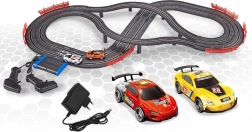 Denne racerbane tilbyder en fremragende balance mellem sjov og enkel opbygning. Takket være de to biler og de intuitive controllere kan du straks køre løb. Strømforsyningen er fleksibel – vælg enten 8× AA-batterier (medfølger ikke) eller brug EU-adapteren, som er inkluderet.