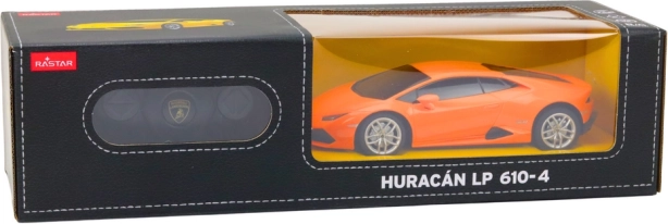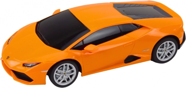 Præsenterer den fjernstyrede bil Lamborghini Huracan LP 610-4, der er en tro model af det klassiske italienske mærke. Denne model fremhæver eksklusiv orange lakering og tonede ruder, som tilføjer til dens autenticitet.