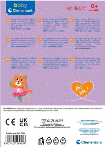 Den plyssede kat skiller sig ud med sit farverige udseende og varierede teksturer, som stimulerer barnets sanser.