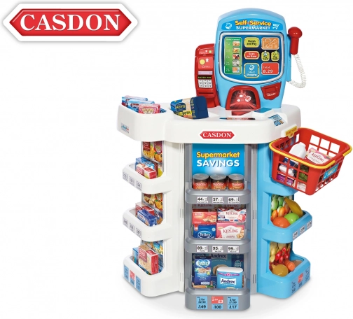 Den stilfulde børne-selvbetjeningskasse fra Casdon gør butik-lege til en ægte oplevelse: den byder på realistiske lyde, touchskærm og elektronisk display. Inklusive chip-and-pin-terminal, scanner, sedler og mønter, madreplikker og indkøbskurv. Højde 75 cm, egnet fra 3 år.