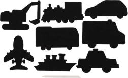 Sættet indeholder 8 forskellige ridse-designs, inklusive fly, bil, tog og flere.