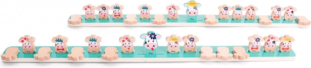- 2 baser med små køer (56 × 4 × 4,5 cm), 16 kort med billeder af små køer