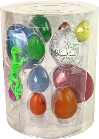 I pakken finder du 12 stk. æg i forskellige farver, mønstre og størrelser (fra ca. 3 × 2 cm til 6 × 4,5 cm) samt et grønt dinosaur-”skelet” på 6 cm. Det hele er pakket i et praktisk plastetui og gaveæske.