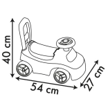 Det praktiske opbevaringsrum under det opklappelige sæde rummer små legetøj eller skatte for den lille rejsende. Rattet inspirerer til leg, og de stille hjul passer også indendørs. Den lette plastkonstruktion er nem at bære og tåler daglig brug.