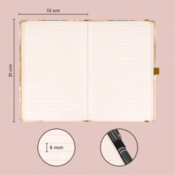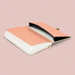 Indeni finder du 172 sider på kvalitets gult papir, ideelt til daglig skrivning. Notesbogen er perfekt som dagbog, til arbejdsnotater, planlægning og kreative idéer. Den indre lomme rummer småting, visitkort eller klistermærker.