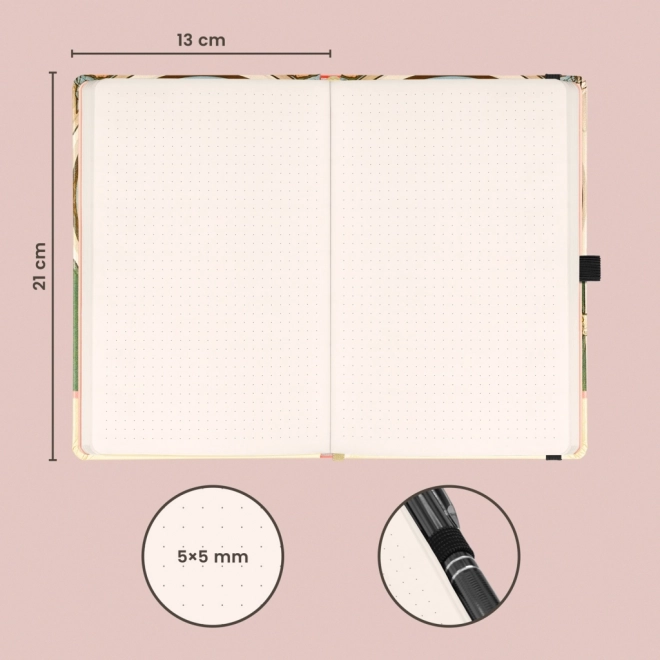 Den stilfulde prikkede NOTIQUE-notesbog med kunstmotiv af Alfons Mucha er ideel til daglige noter, planlægning og kreative indslag. De hårde omslag beskytter indholdet, den elastiske lukning holder alt samlet, og den praktiske penneholder sørger for, at pennen altid er ved hånden.