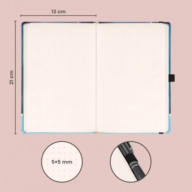 Elegant notesbog med motiv af værket Alfons Mucha – Luna i hårde omslag. Den tilbyder et prikket layout til kreative noter, elastiklukning, lomme til småting og penneholder. Indeni er der 172 sider på behageligt gult papir i størrelsen 13 × 21 cm – ideel til planlægning, bullet journal og skitsering.