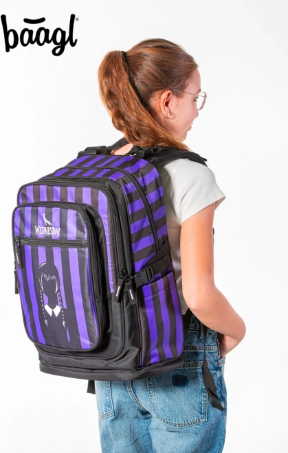 Stilfuld skolerygsæk i CUBIC-serien inspireret af motivet WEDNESDAY tilbyder ergonomisk formet ryg, lav vægt 1,2 kg og volumen 29 l. Tre rum med organizer og lomme til 15" bærbar, reflekselementer for sikkerhed og slidstærkt vandafvisende materiale gør den til et ideelt valg til både skole og fritid.