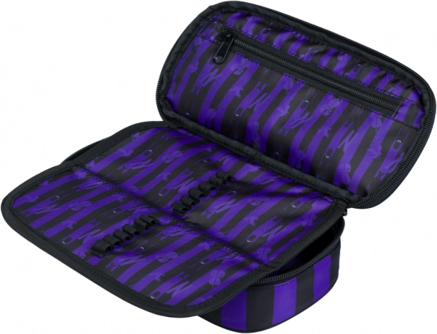 Stilfuldt BAAGL skolepenalhus med WEDNESDAY-motiv i sort‑lilla striber, der tilbyder solid konstruktion, overskuelig indvendig organisering med udklappelig skillevæg og praktisk lynlåslomme. Ideelt til skole og rejser, uden indhold – klar til at blive personliggjort efter dine behov.