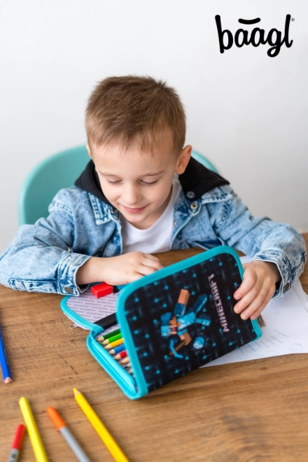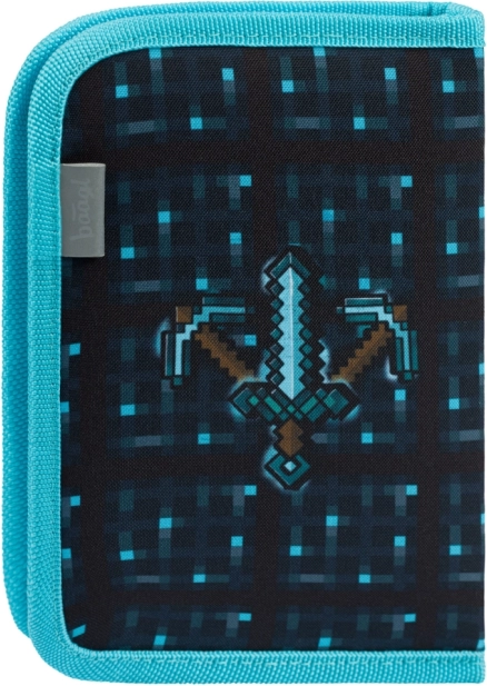 Minecraft-motiv med pixelerede økser giver dette penalhus en unik spilatmosfære.