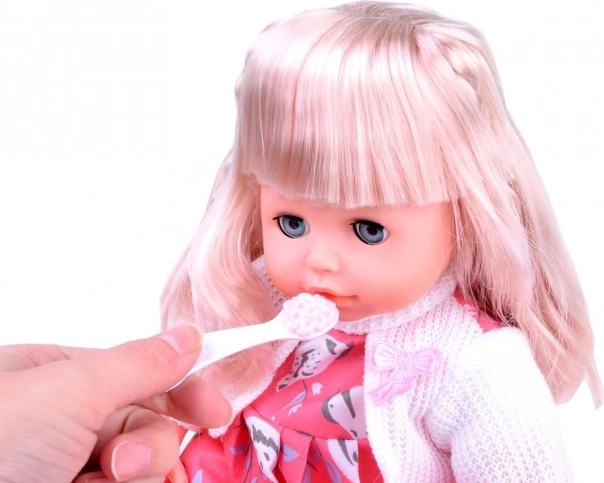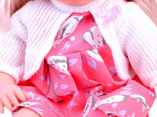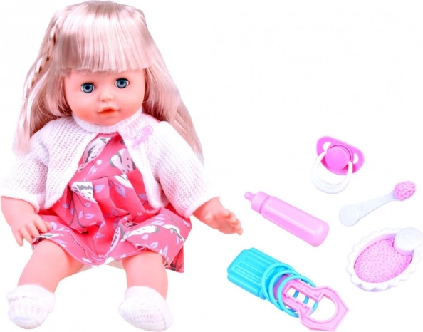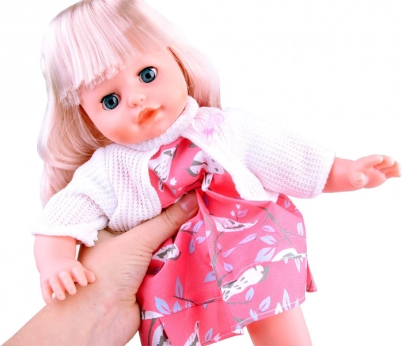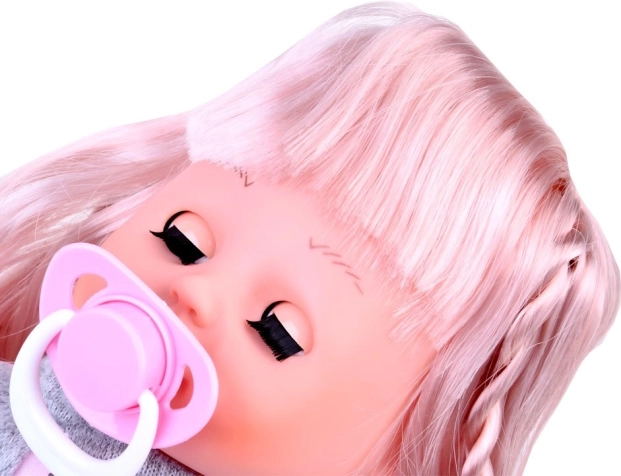 Dukken med langt blondt hår og et sødt rosa sæt har en blød krop, perfekt til at kramme. Når den lægges ned, lukker den øjnene, hvilket gør legen endnu mere realistisk. Med det medfølgende tilbehør udvikler børn finmotorik, empati og fantasi.