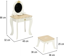 Der medfølger også en skammel, så man kan sidde behageligt. Produktet er fuldstændig lavet af glat slebet træ, belagt med giftfri maling, i et elegant hvidt-guld design, som vil pryde ethvert børneværelse.