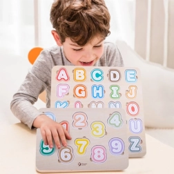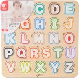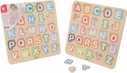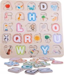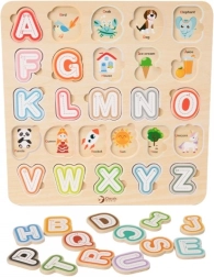 Dette kvalitetsrige træalfabet i størrelsen 30 × 30 cm støtter de første skridt mod læsning og skrivning. De farvede, udtagelige brikker indsættes i de tilsvarende former, hvorved børnene træner øje–hånd-koordination og rumlig forestillingsevne. Takket være billederne under bogstaverne bliver de også på legende vis introduceret til engelske gloser.